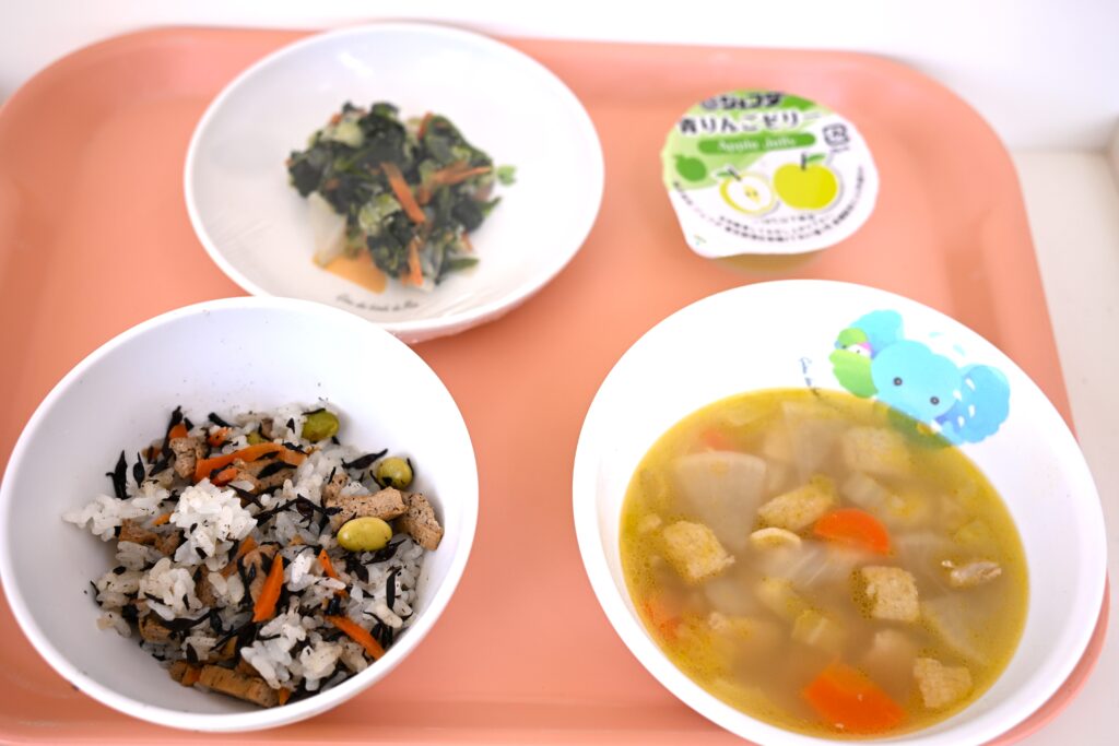 今日の給食は「ひじきご飯、けんちん汁、野菜の胡麻和え、ゼリー」です。子どもたちは、よく噛んでおいしく食べていました!