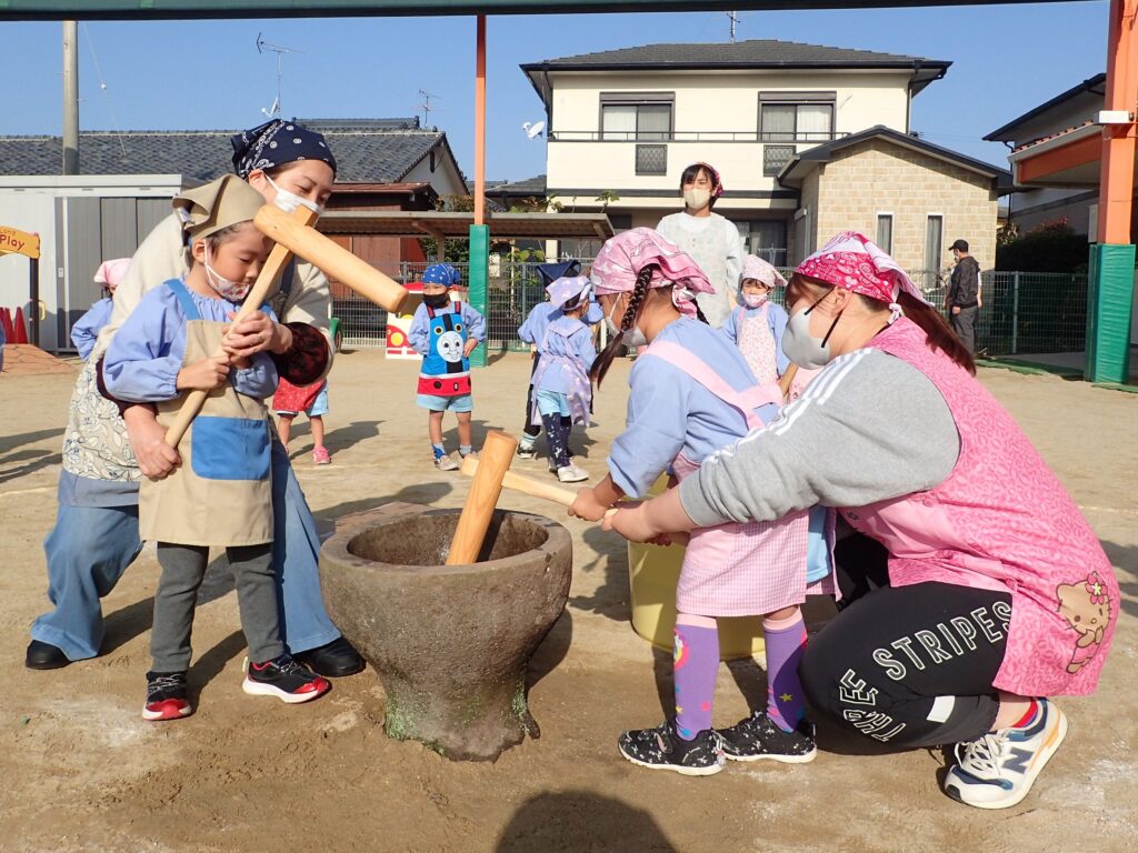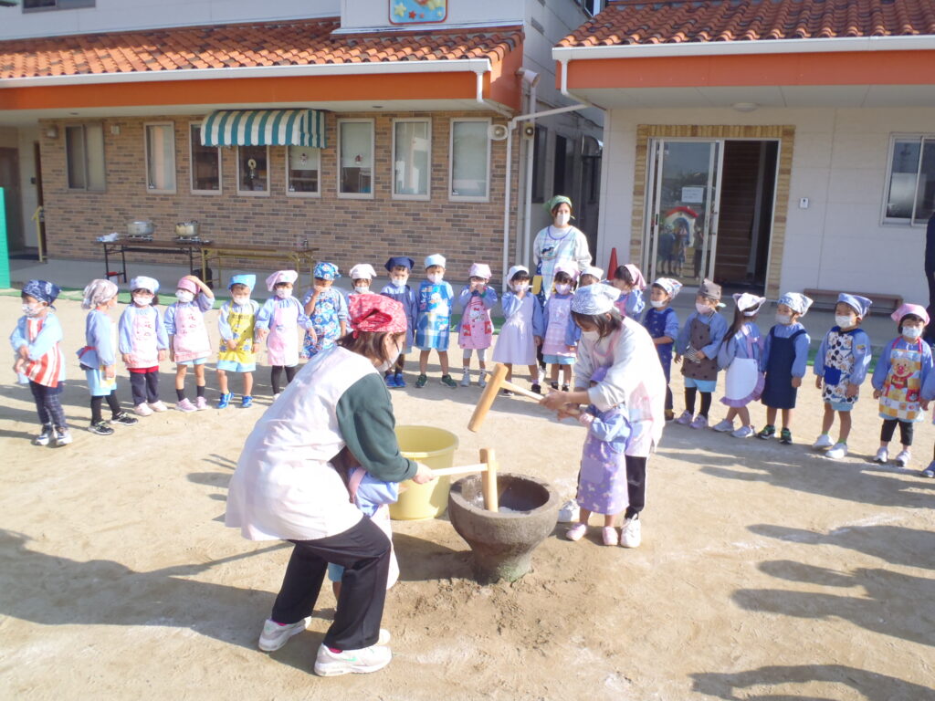 12月2日にお餅つきをしました!2歳児~年長児まで、杵を使っておもちをつく体験をして、まるめたおもちを「きなこもち」にして食べました。とってもおいしかったです!