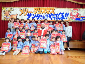 今日は園にサンタさんが来てくれました。「あわてんぼうのサンタクロース」を歌って、一人一人にプレゼントをもらいました。