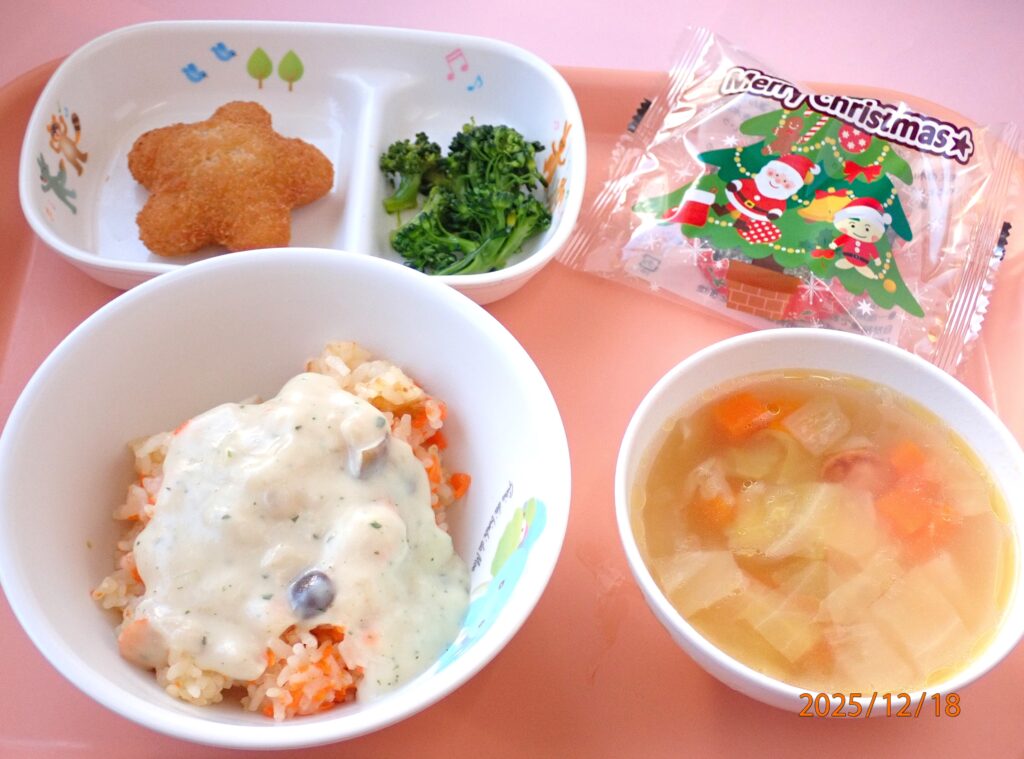 今日の給食は、クリスマスメニューです!「えびクリームライス、星形コロッケ、ブロッコリー、具沢山ポトフ、ケーキ」です!
