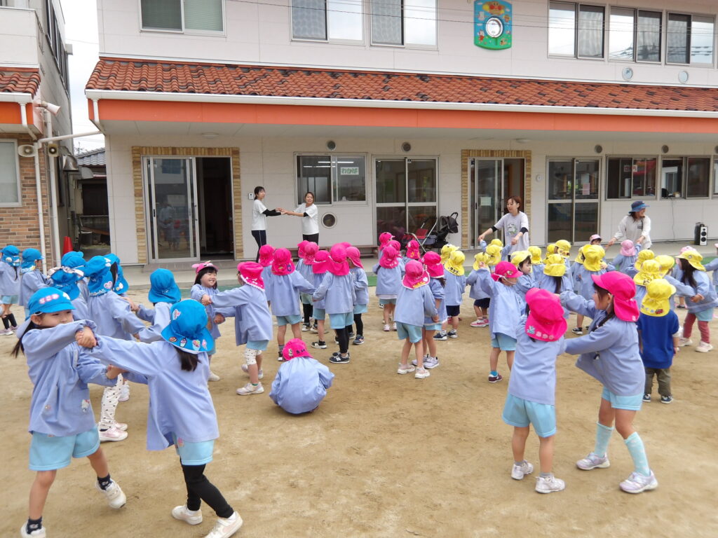 晴れたので、お外でお集まりしました!先生の話を聞いて、遠足で踊るダンスを練習しました!みんなノリノリで踊っていました!