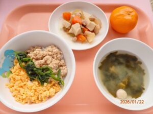 今日の給食は「そぼろ丼、高野豆腐の煮物、味噌汁、みかん」でした。彩り豊かに栄養満点!寒さに負けない体を作っていきたいですね。
